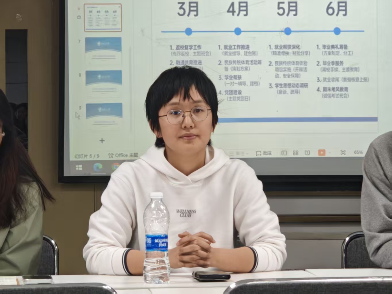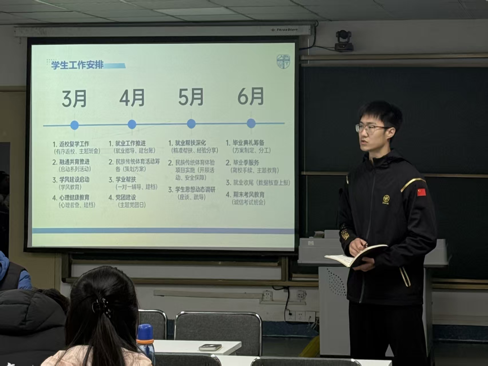 教务员高明、专职辅导员舒士轩、兼职辅导员胡睿分别就教学安排、学生工作、支部工作等具体事务作了说明。